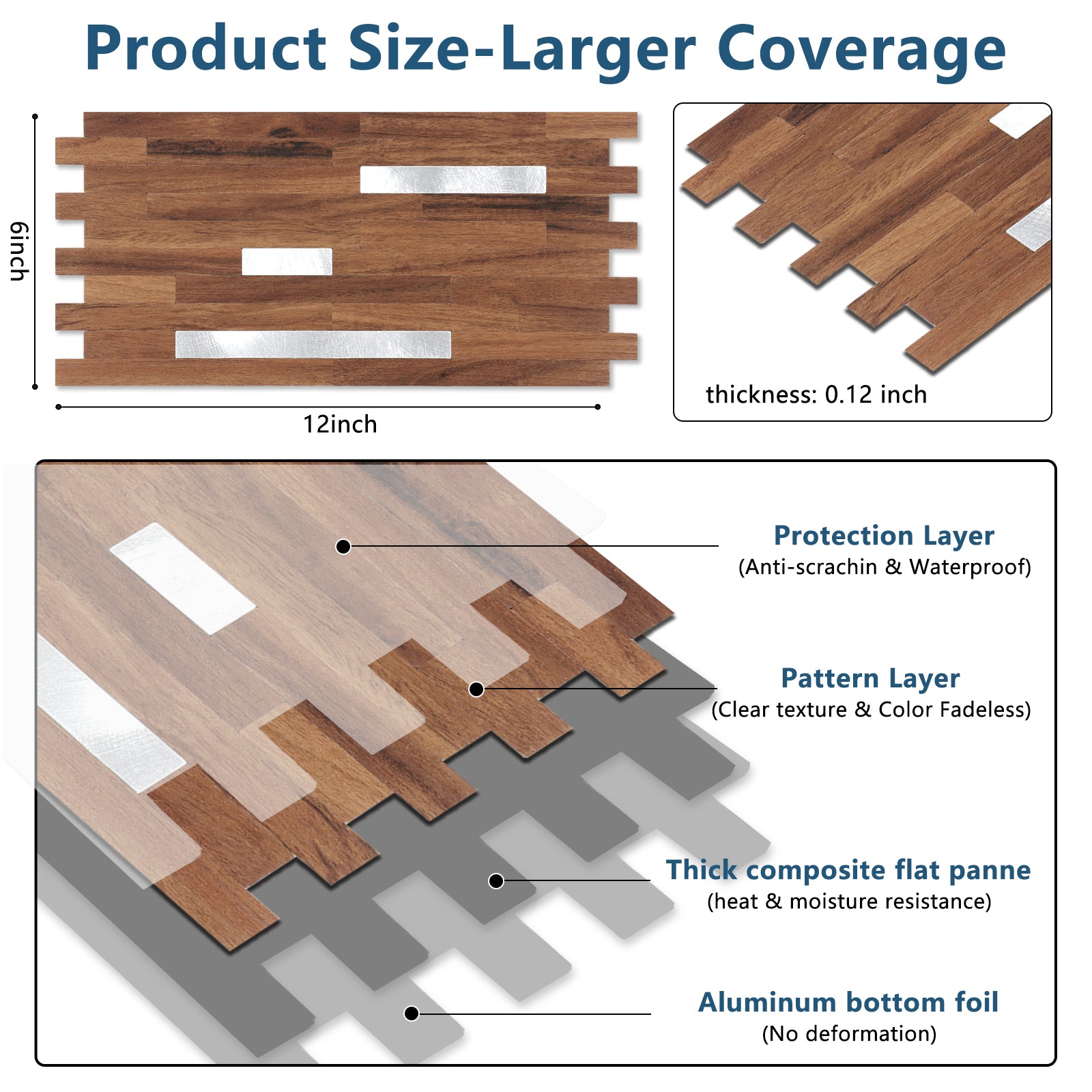 • WATERPROOF & HEAT RESISTANT - Made of PVC composite laminate, Waterproof, heat resistant, stain resistant, anti-scratch, high impact, color fadeless, easy to clean, more durable, and stronger than other plastic self-adhesive tiles.